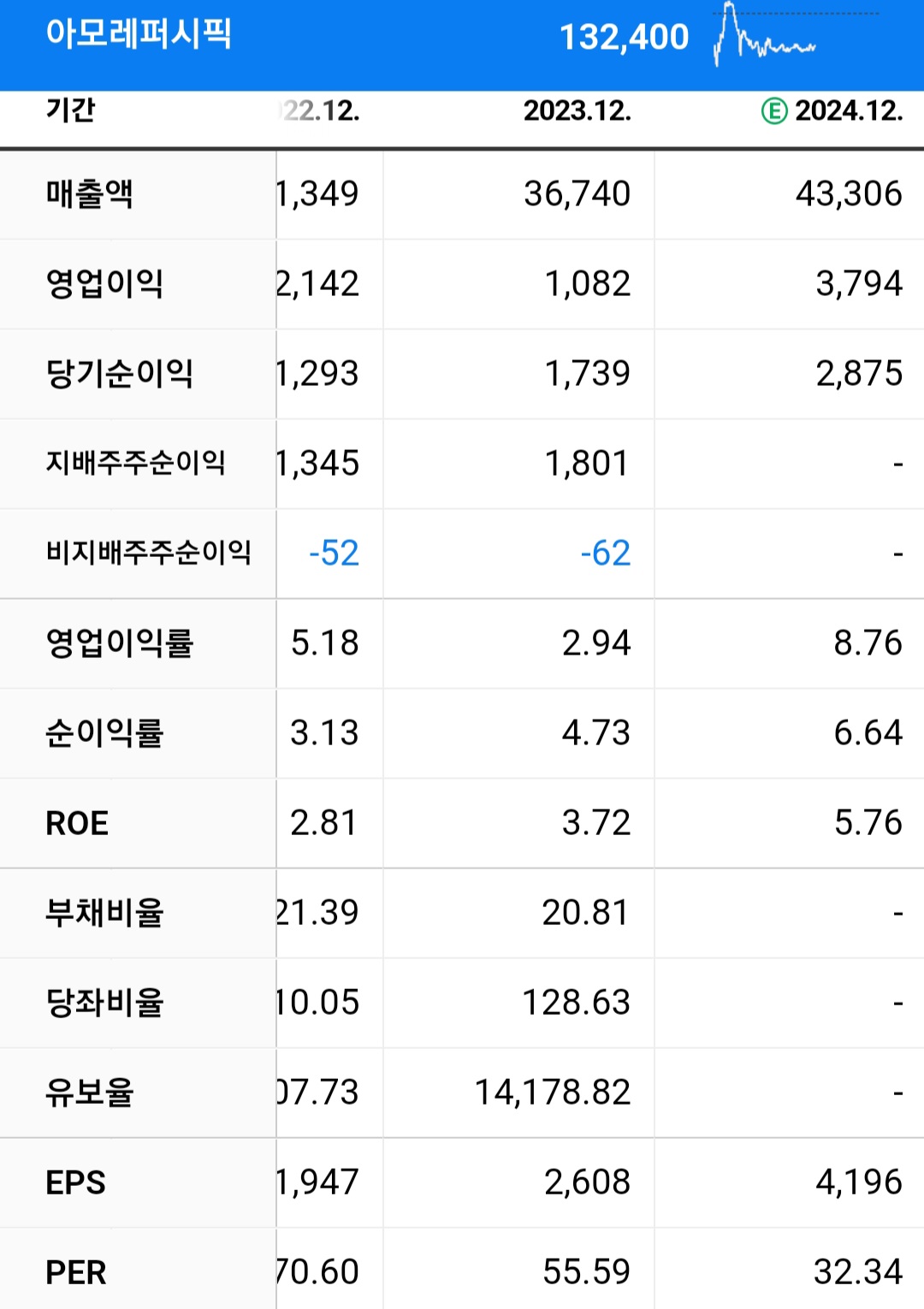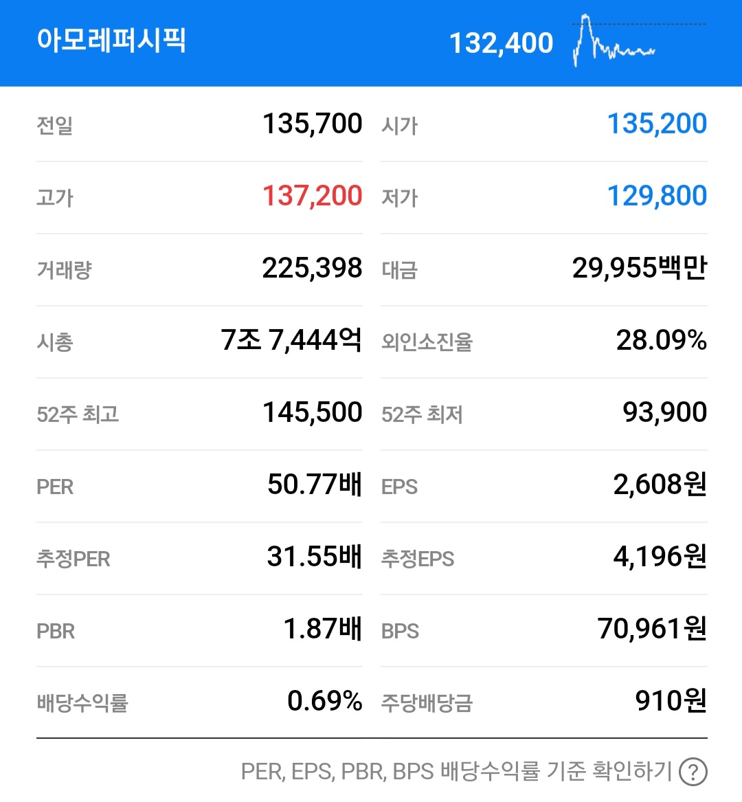 PER은 73배를 받고 있고 EPS는 604원입니다. PBR은 14배를 평가받고 있고 BPS는 3026원입니다.