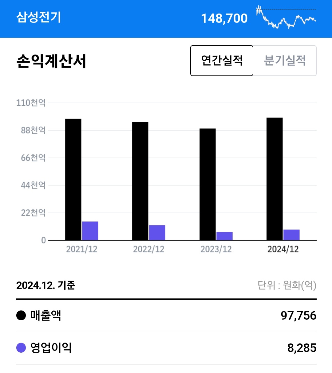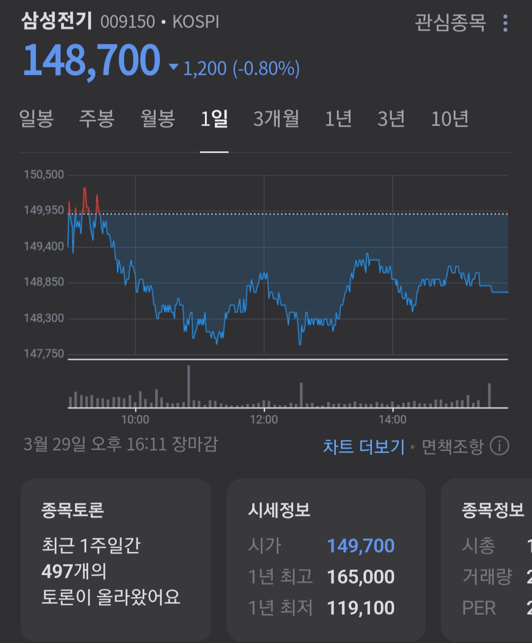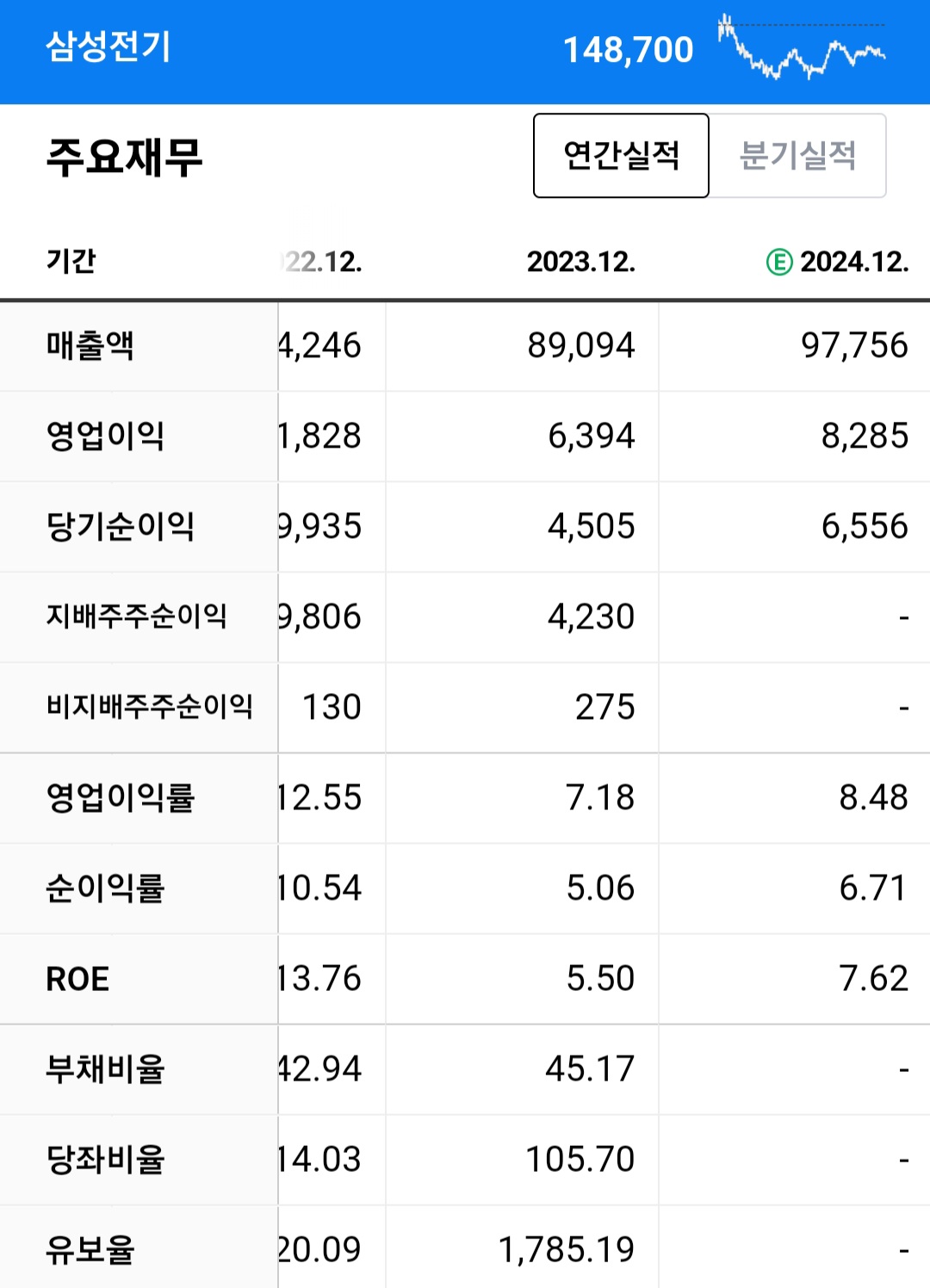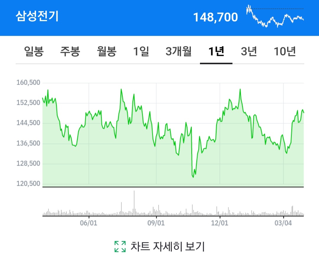 이루고 있고 현재 삼성전기주가는 148,700원입니다.