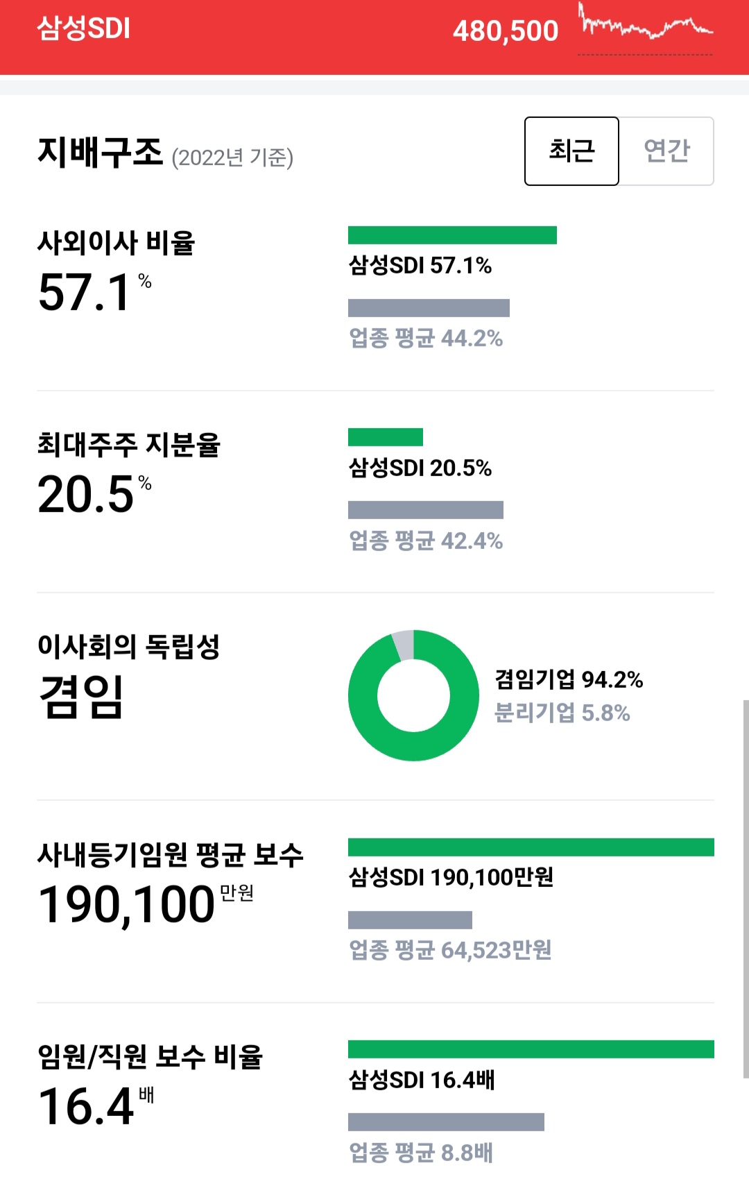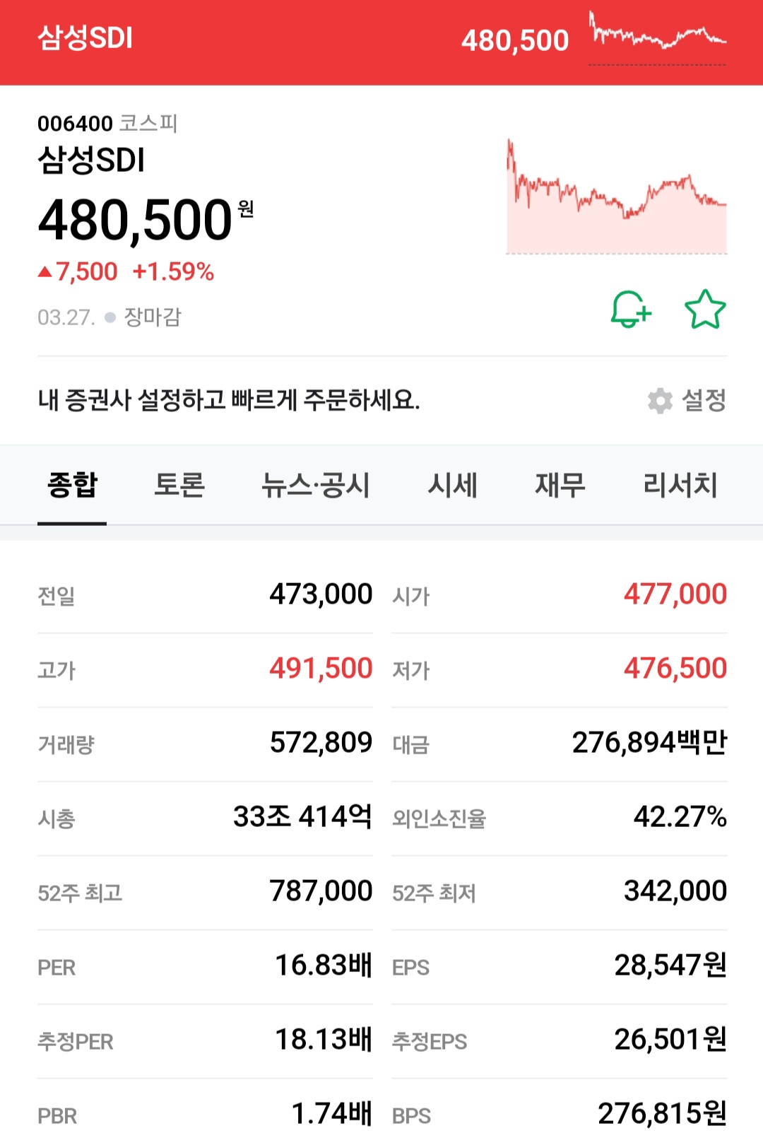 현재 삼성 SDI의 주가는 48만 5000원 정도의 주가를 유지 하고 있습니다. 지난 1월부터 조금씩 상승이 이어져 오고있습니다.