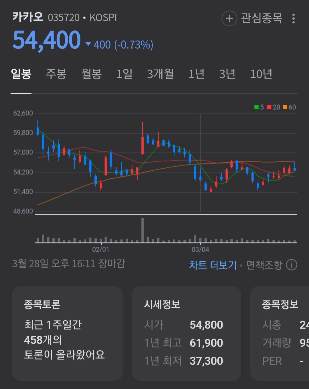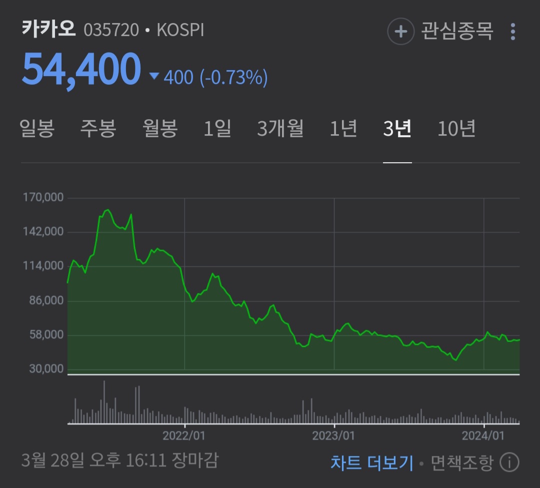 카카오의 주가 역시 네이버와 비슷하게  2023년 1월 이후로 다시 상승을 하기 시작해서 3만 8000원까지 하락했다가 현재는 54400원까지 주가를 회복한 모습입니다.