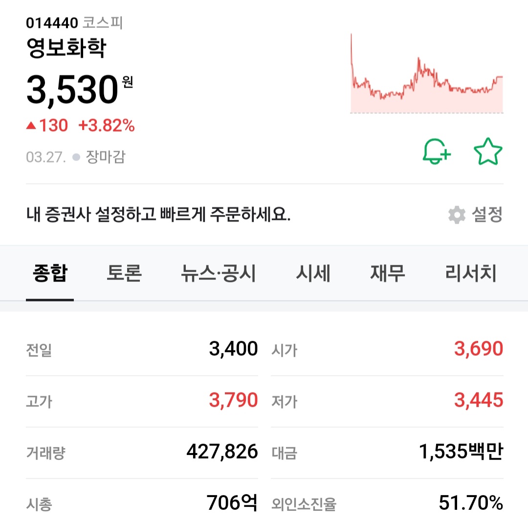 그 다음 일곱번째로는 영보화학입니다. 영보화학 같은 경우도 이제 폴리에틸리라든지 일회용품이나 산업용 비닐 등을 제조하는 회사로서 세종시험에 그 공장을 보유하고 있어서과 세종시 수혜주로서 선정이 되었던 이력이 있습니다.