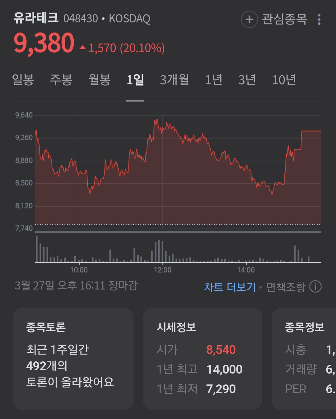 일단 첫 번째 관련주는 유라테크입니다. 세종시 관련 주고 세종시에 이제 토지를 보유하고 있다고 해서 관련 엮기고 있구요.