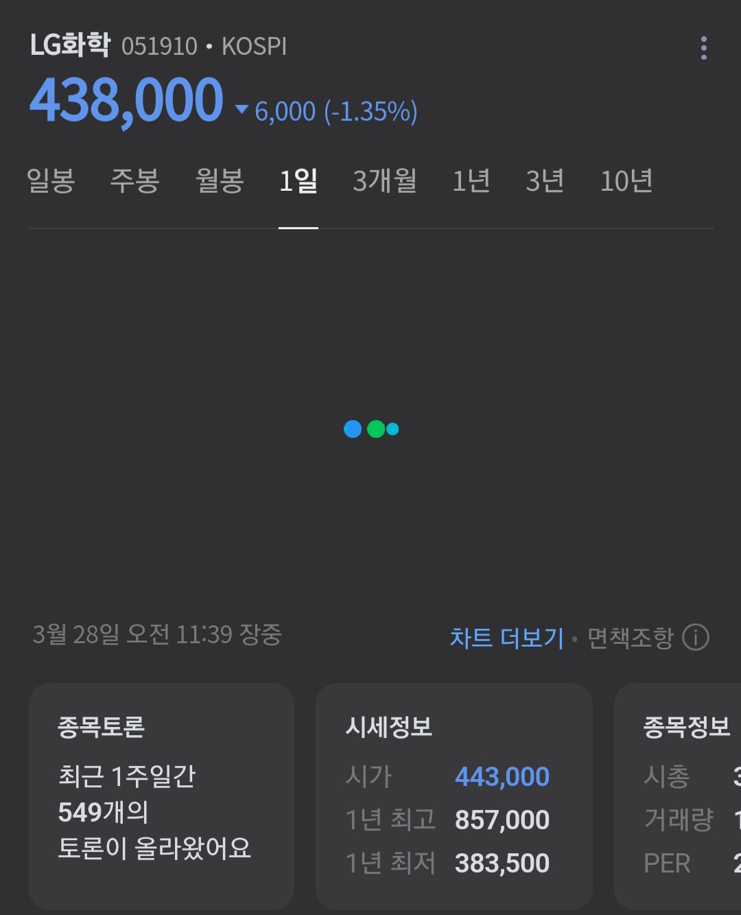 현재 주가가 43만 8000원 정도로 형성되어 있습니다. LG화학 같은 경우에는 현재 시가 총액이 30 조 9547억이며