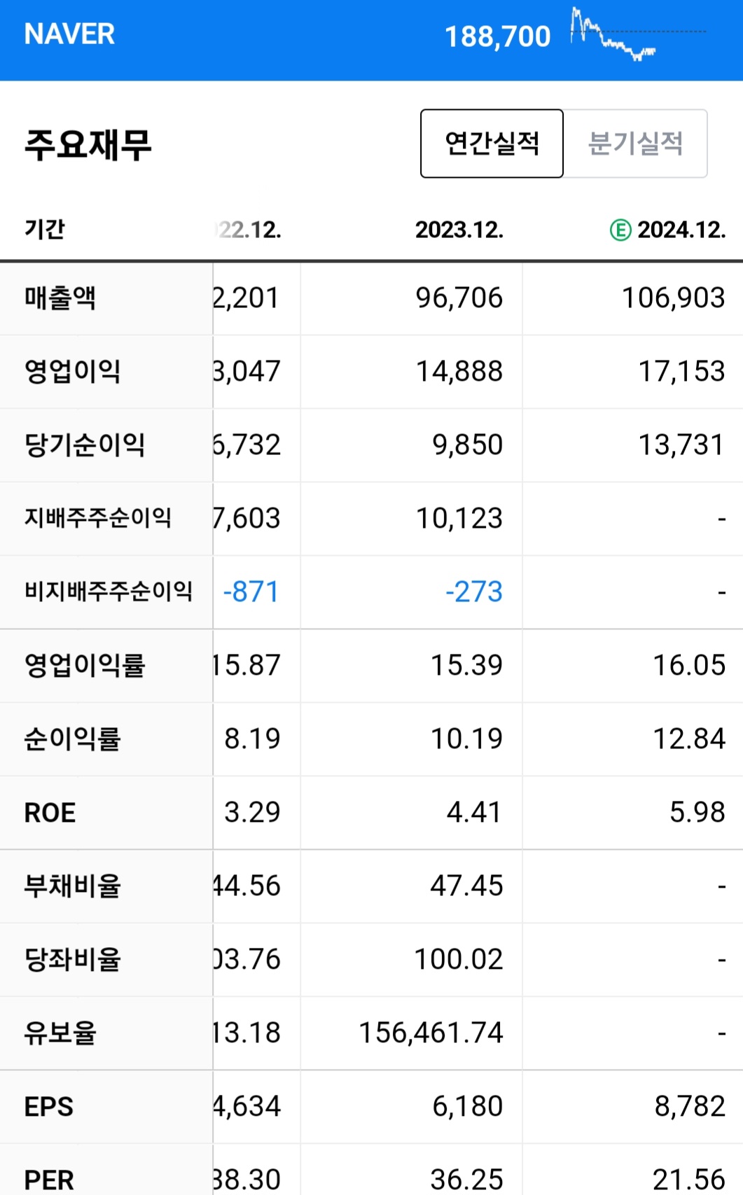 2022년도는 주가가 4만원에서 거의 16만원까지 올라갔는데 현재 2022년 6월달 쯤에 최고점 26만 8000원 정도를 한번 찍고 지금 현재에는 하락세를 유지하고 있는 모습입니다.