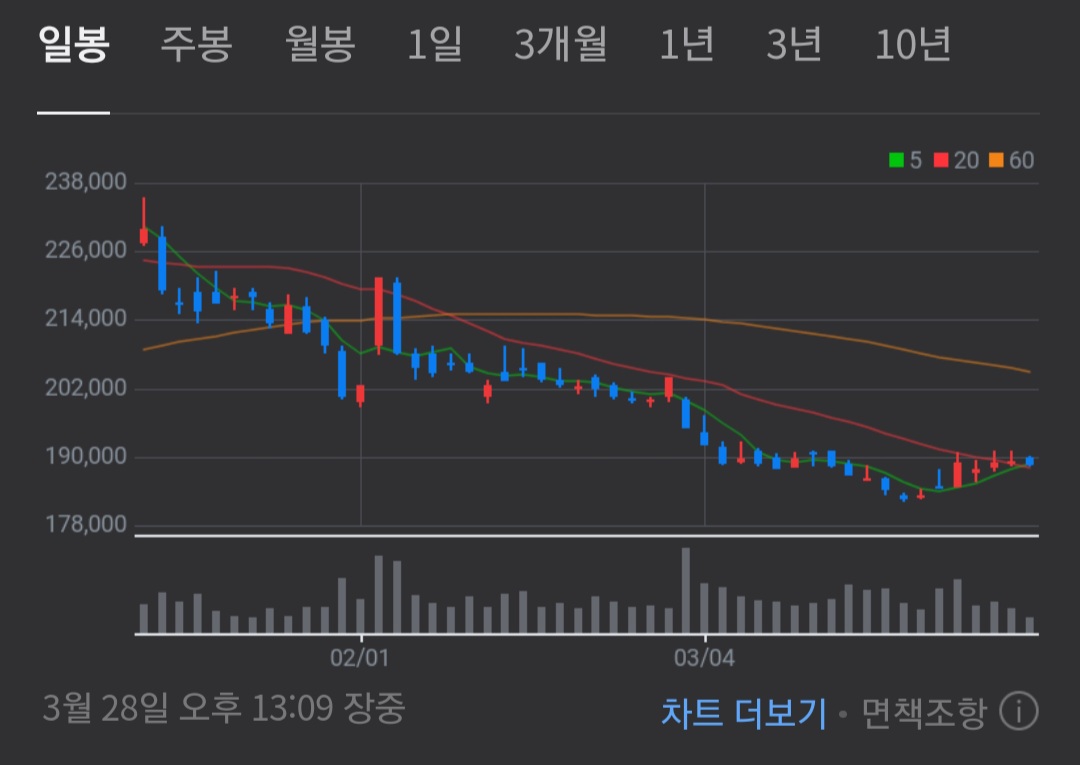 현재 18만원까지 많은 하락을 한 모양새라 조금만 더 바닥을 찍거나 아니면 현황에서도 다시 반등해 올 수 있을 거라고 생각합니다.
