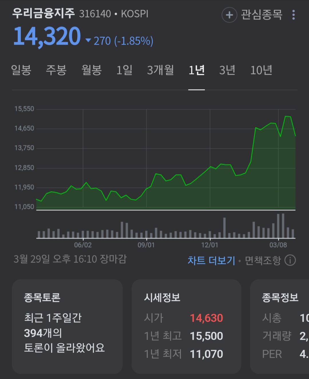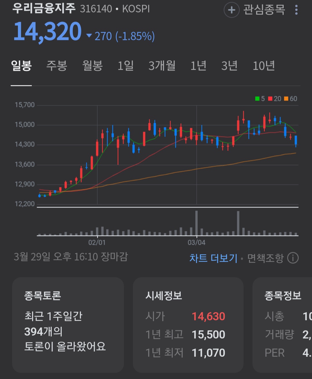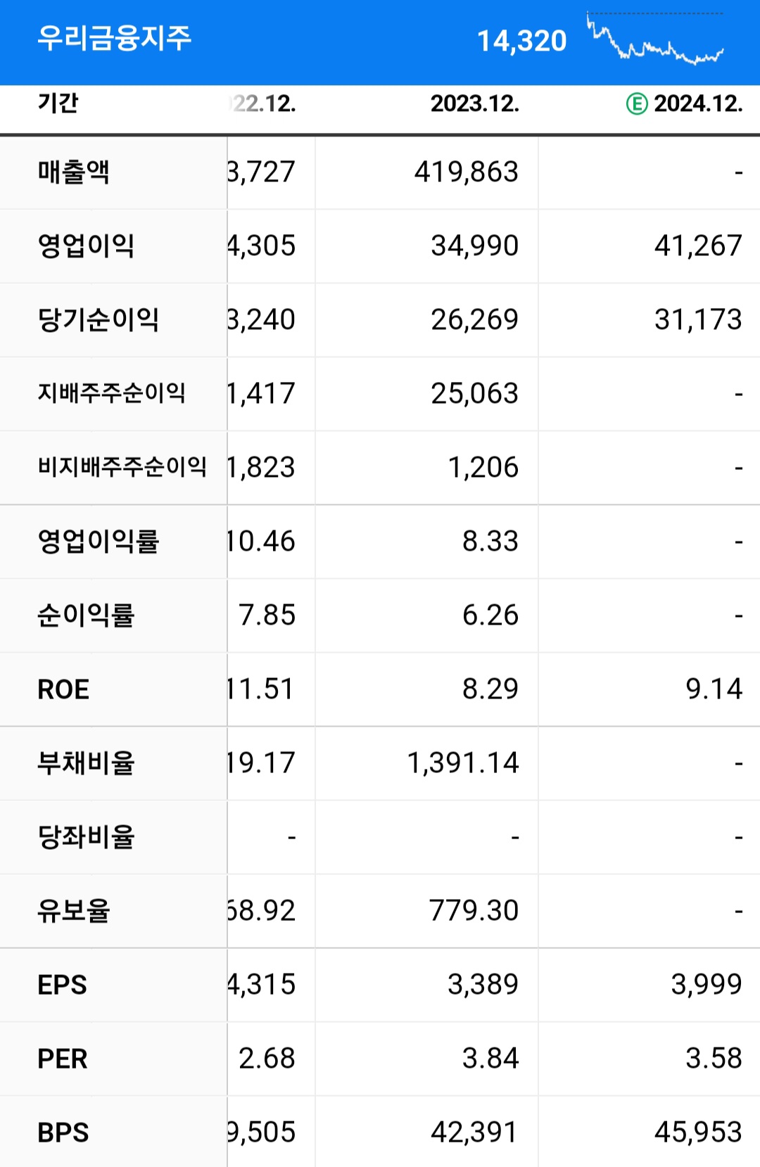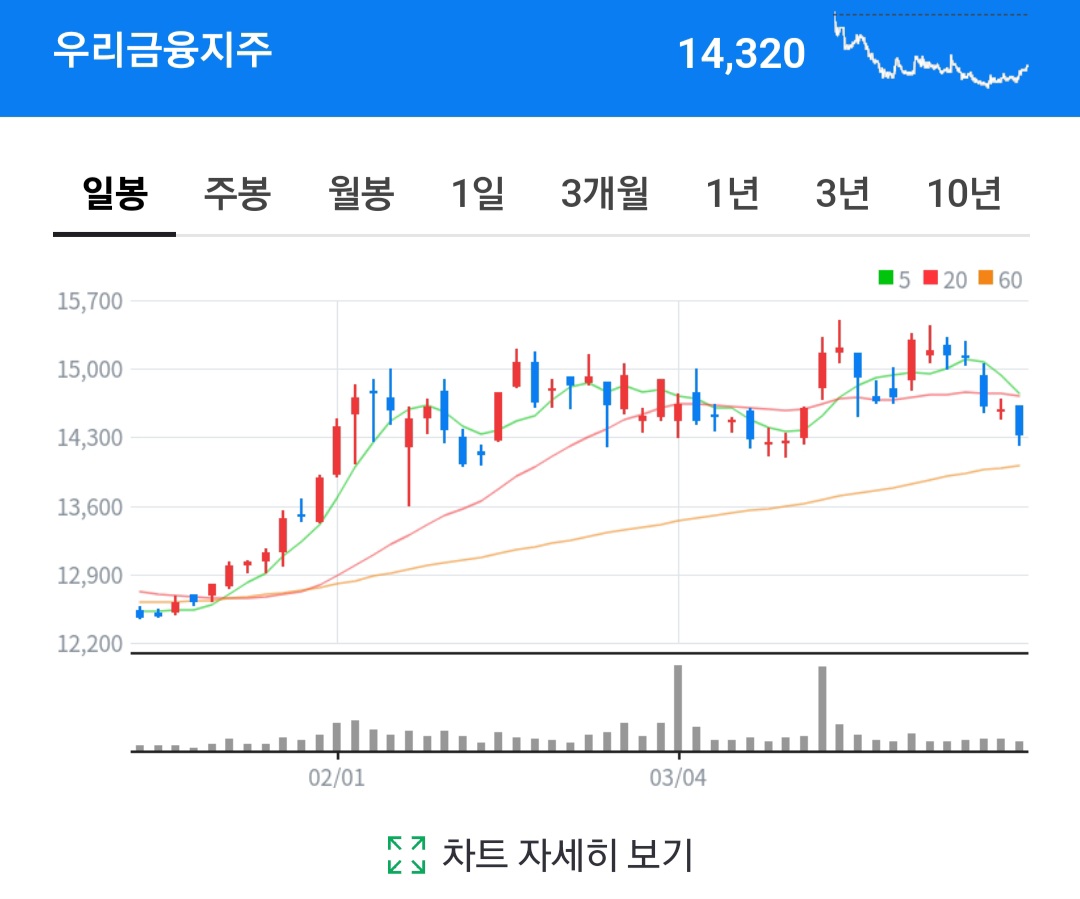 시가총액 중에 10조 8000억 원의 현재 52주 최고가는 15,500원 정도이며 현재 우리 금융지주의 주가는 14,320원에 안착해있고 외인 소진율 같은 경우는 41.17%입니다.