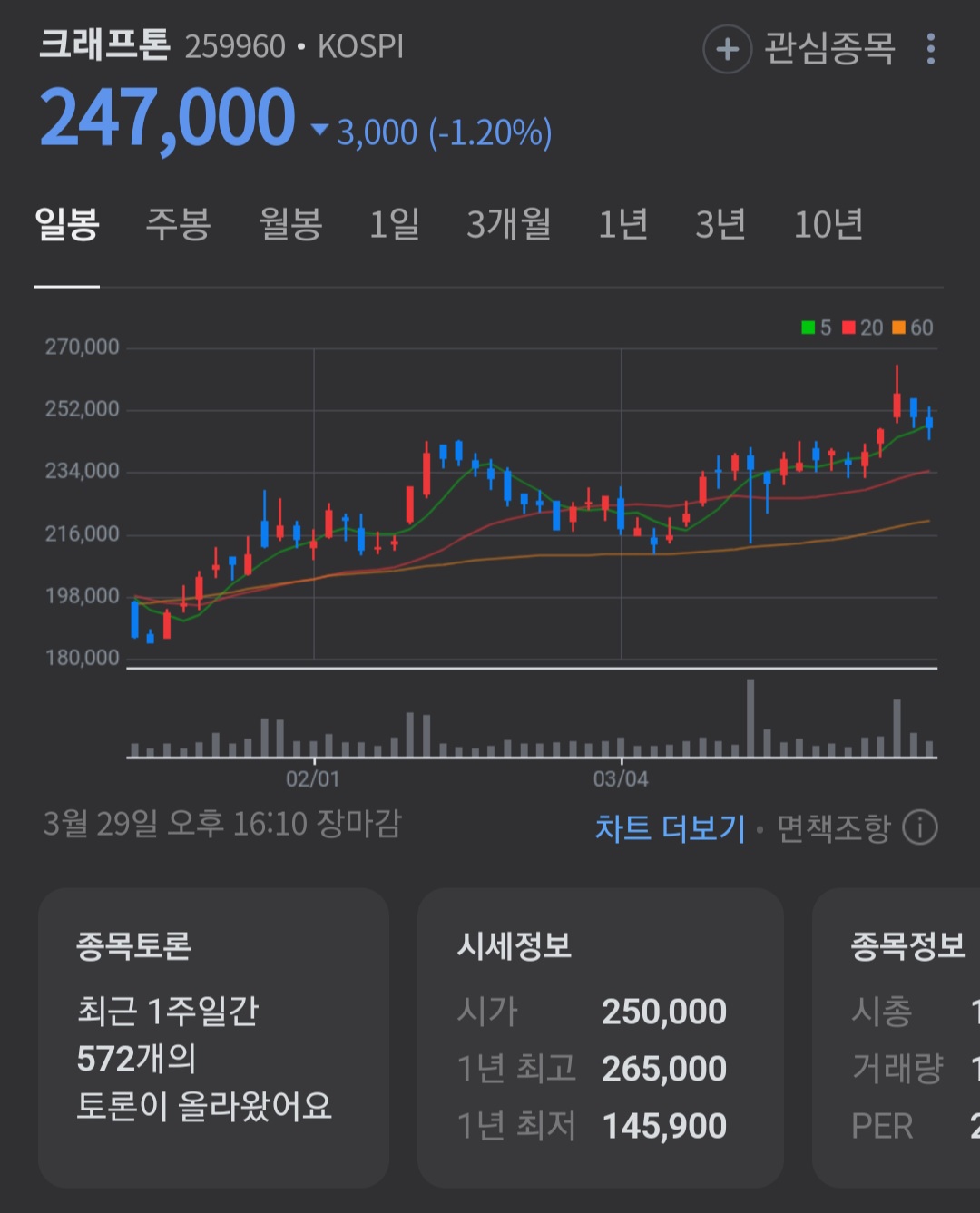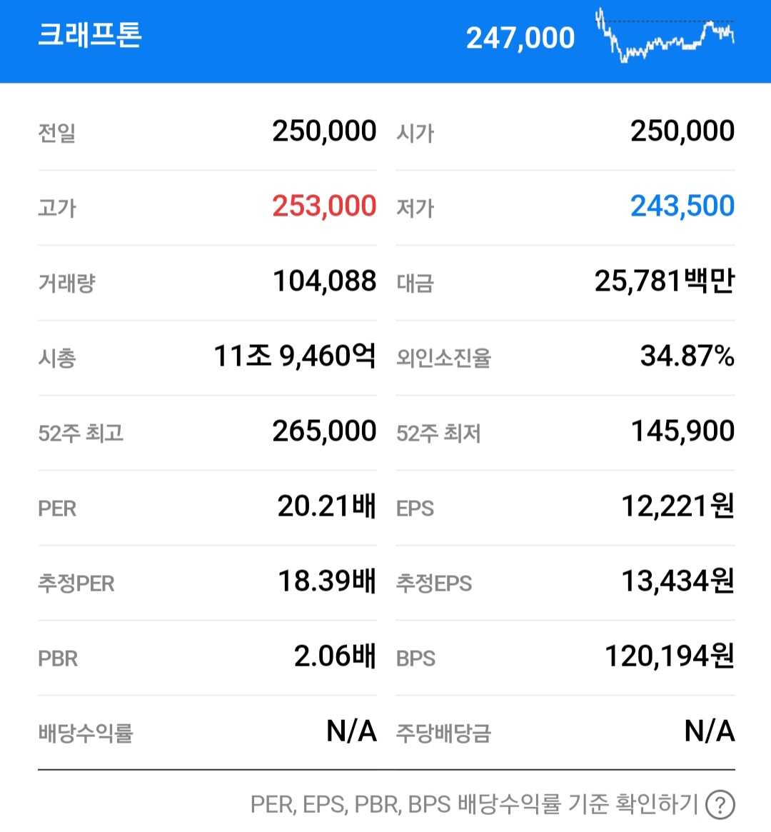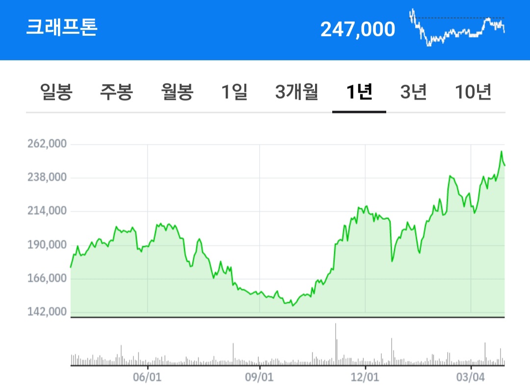 현재 크래프트 톤의 목표 주가를 증권가들은 25만원에서 20만원 후반대까지 보고 있는 걸로 보입니다.