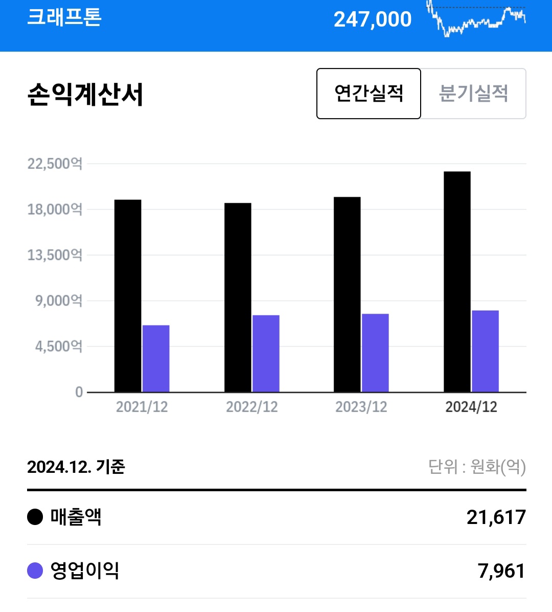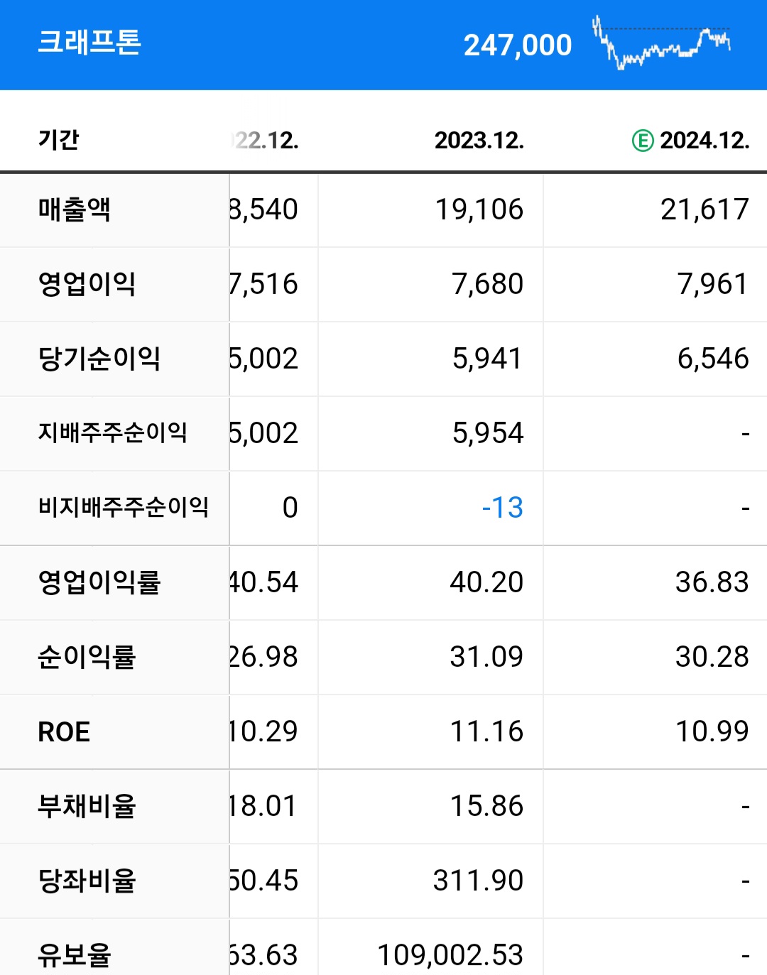 현재 순이익 같은 경우도 거의 한 5% 정도 영업이익기 상승한 걸로 보이는데요. 대체적으로 크래프톤을