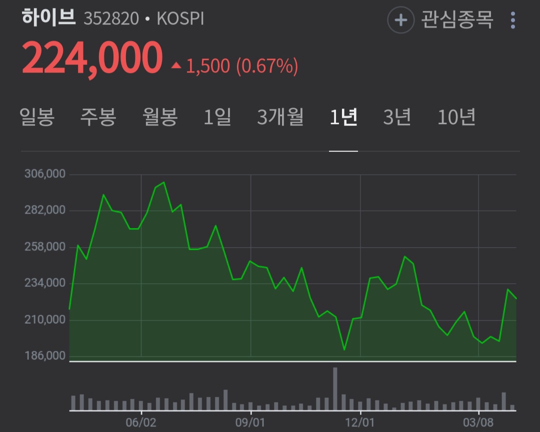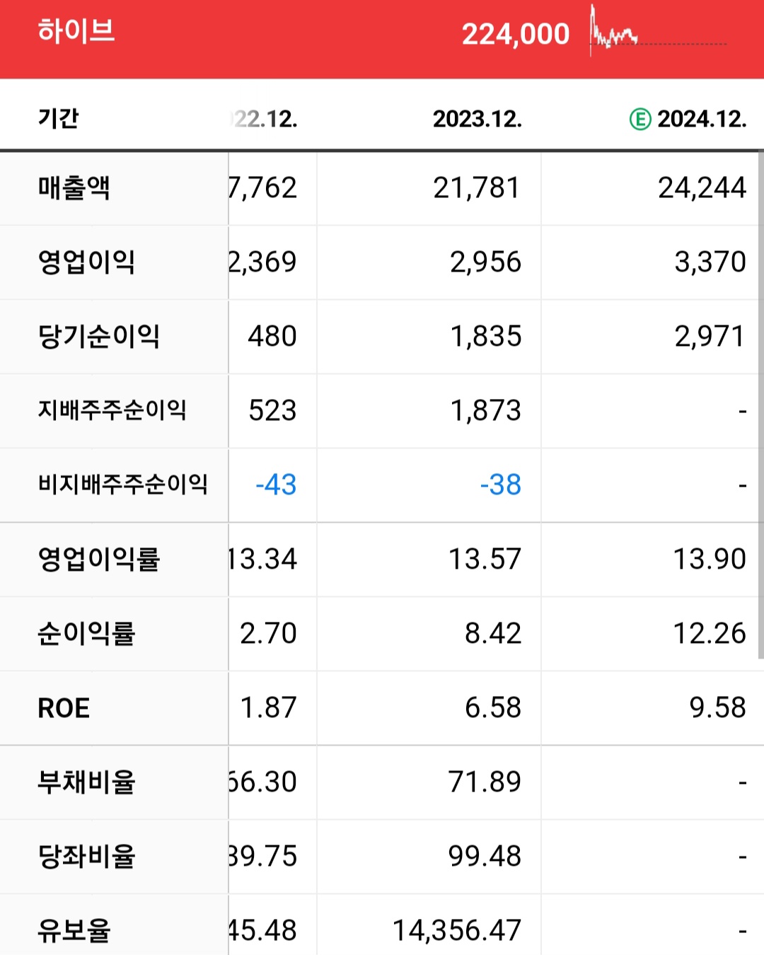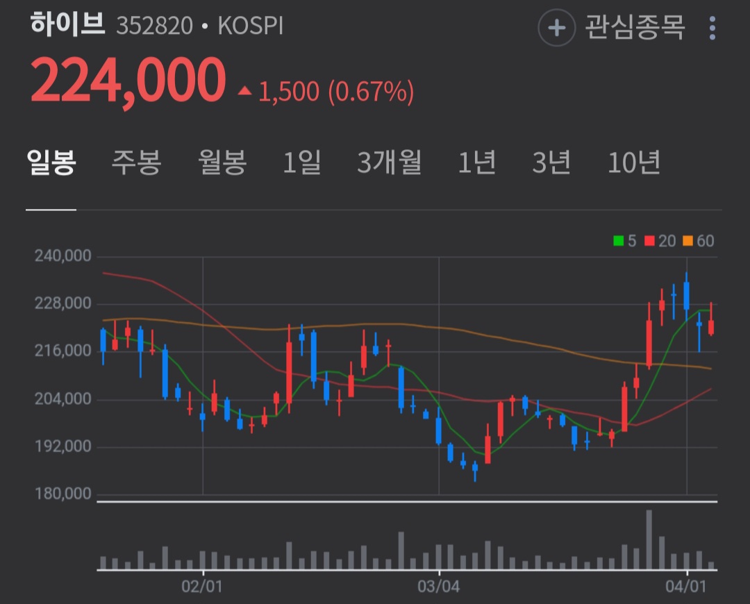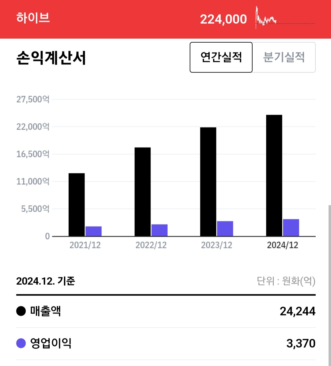 현재 가격은 22만 3000원 정도 이기 때문에 추가적으로도 상승할 여력이 있을 것 같고 1분기는 약 100억 원 2분기 사상 최대 금액인 1100억 원 내에 영업이익을 내고 있습니다. 비티에스 진의 제대가 6월달에 앞두고 있고요.
