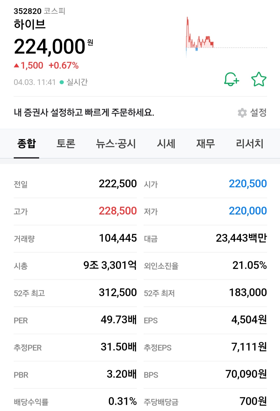 하이브 주가 같은 경우는 현재 222,500원이고 시가총액 같은 경우는 구조 2670억 정도의 안착해 있습니다. 추정EPS는 7,111원이고 PER은 49배를 받고 있습니다.
