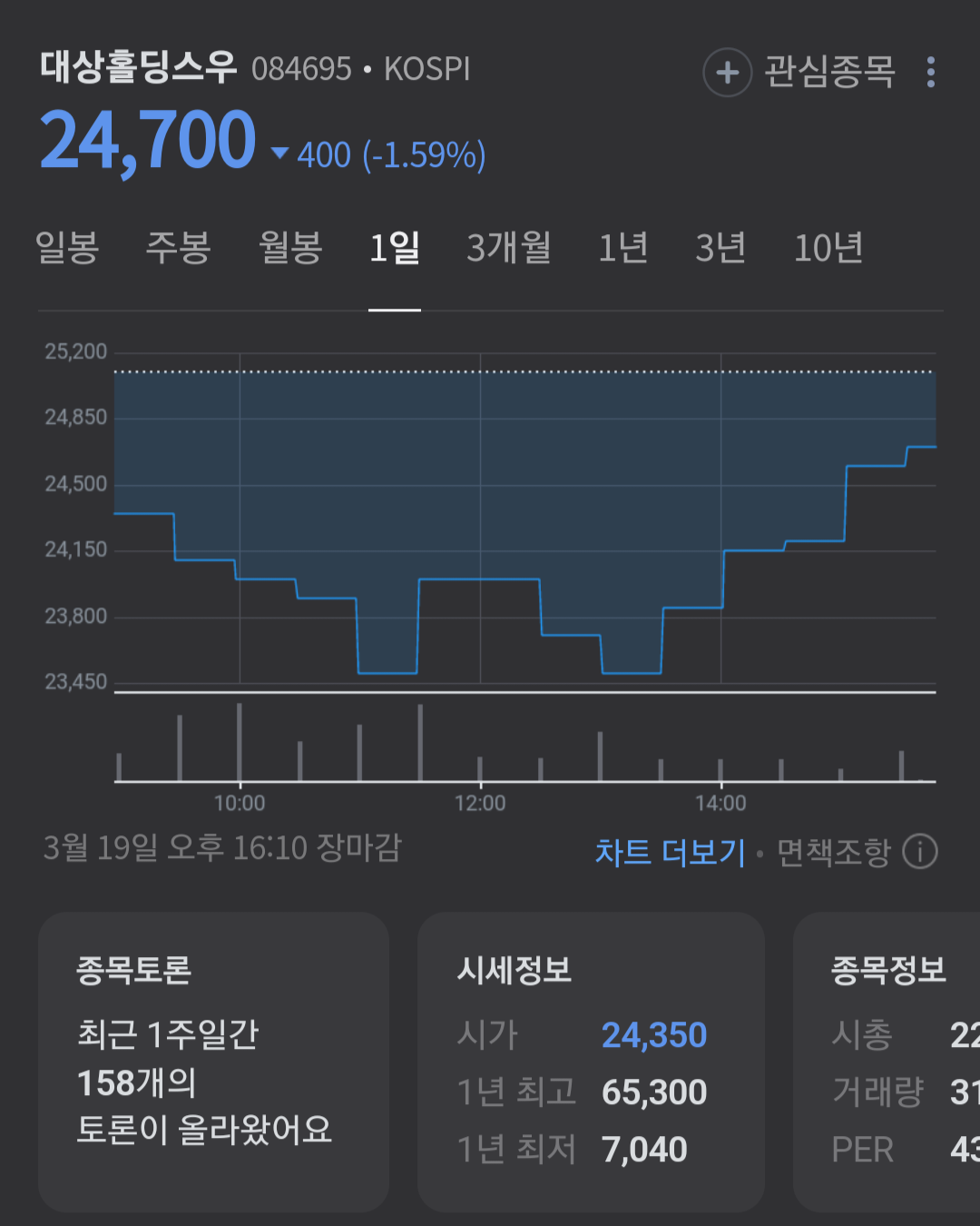 정치 테마주 투자 같은 경우는 뭐 인맥주도 있고 정책추나 있고 정치 테마주라고도 불리기도 하는데요. 아까 여러 가지 변수를 다양하게 고려해서 사용하셔야 할 것 같습니다. 제일 중요한 항원 일단 기업이 튼튼하니 튼튼하지 않냐가 제일 중요하고요. 대상홀딩스 우선주는 추후에도 지켜볼 가능성이 있을 것 같습니다.