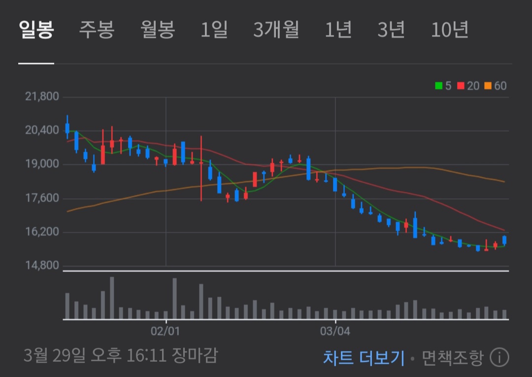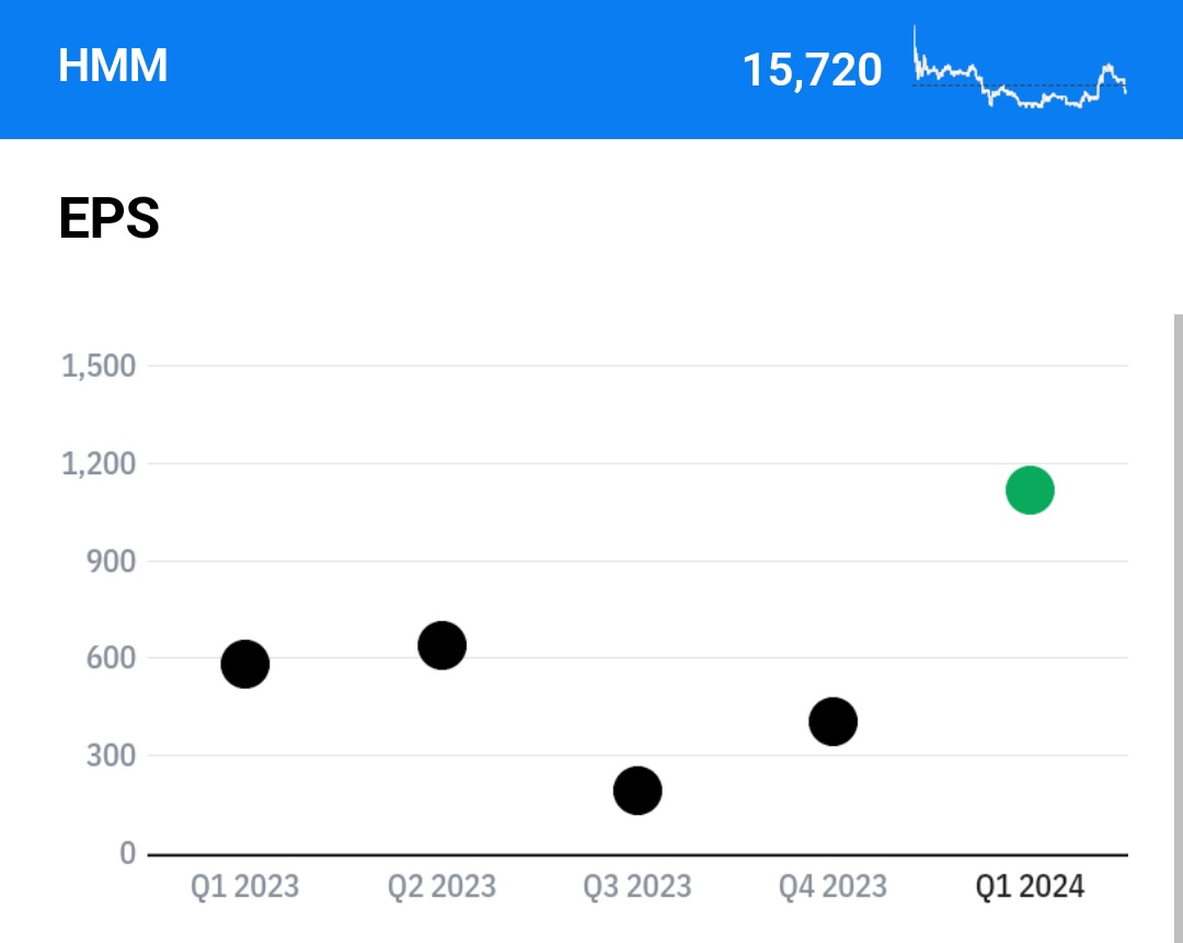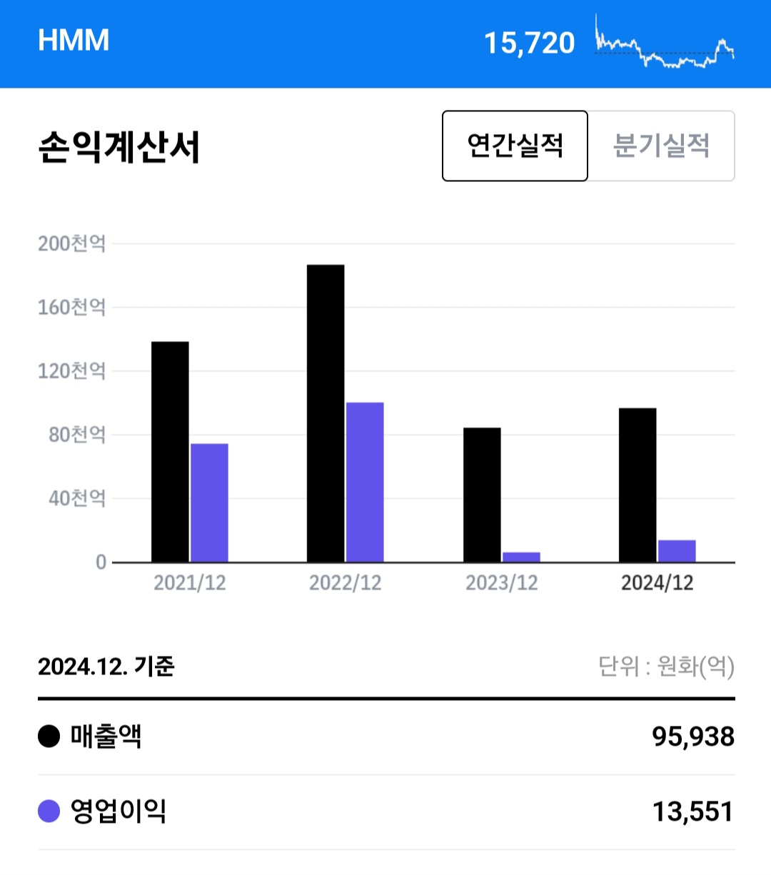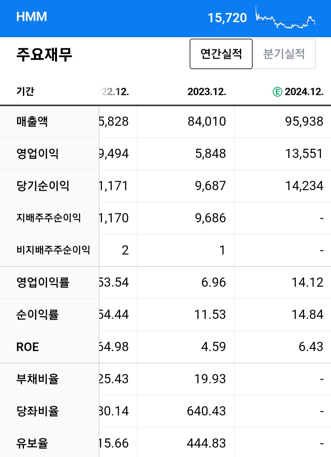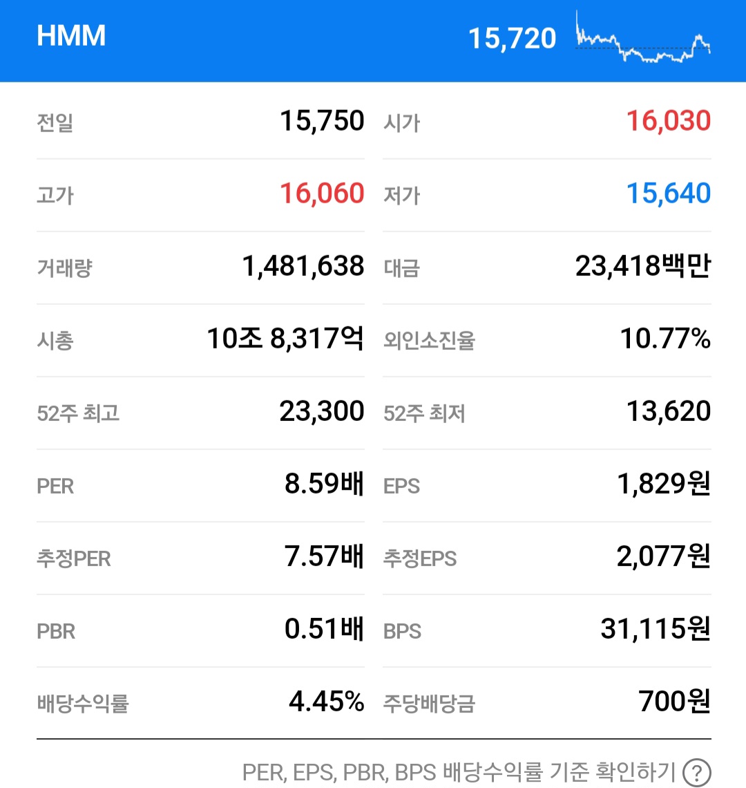 현재 HMM의 주가는 15720원에 안착해 있습니다.